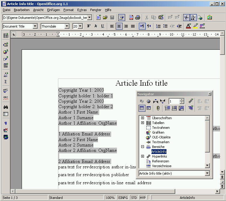 Gehen Sie zum Bereich ArticleInfo, indem Sie ihn im Navigator doppelklicken. Wählen Sie die Vorlage Document Title aus der Vorlagenliste und geben Sie dann den Titel des Dokuments ein. Dieser Titel wird das ArticleInfo-Titel-Element, wenn das Dokument im DocBook-Format gespeichert wird.