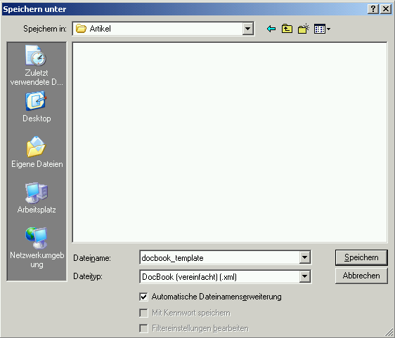 Um Ihr Dokument im DocBook-Format zu speichern, wählen Sie Datei -> Speichern unter aus dem Menü. In der Auswahlliste Dateityp wählen Sie DocBook (vereinfacht) (.xml). Mit dem Speichern-Button können Sie das Dokument dann im DocBook-Format speichern.
